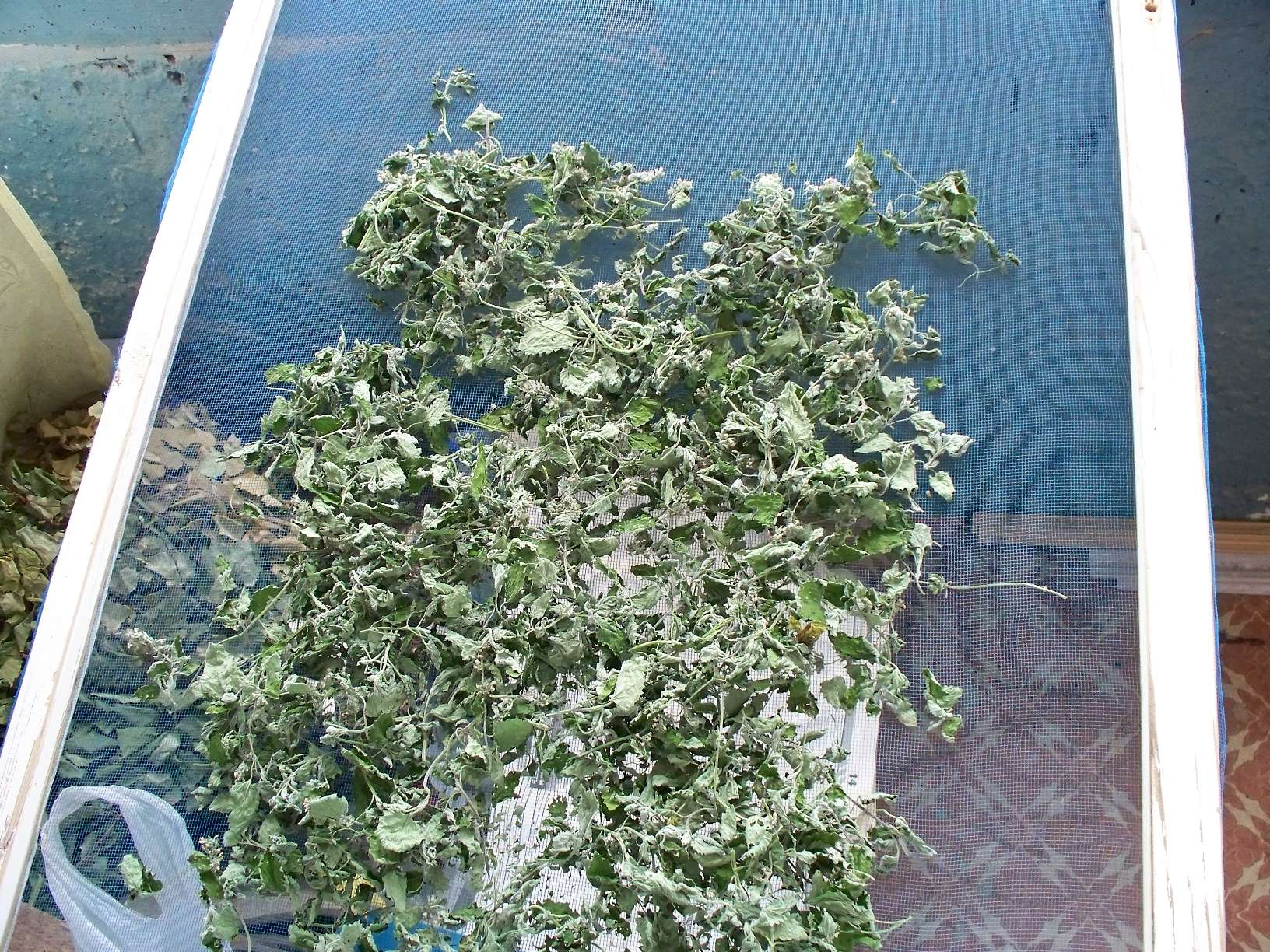 Тревата се оставя на закрито при температура 20-30 градуса за 2-3 седмици. Можете да определите готовността, като вземете лист в ръката си и го стиснете. Ако се чуе характерна хрускане и листата се счупят лесно, тогава растението е готово за съхранение.