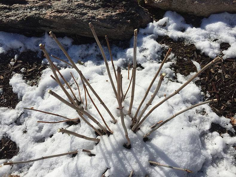Следователно, за по-голяма увереност, резитбата на едролистната хортензия се извършва, когато се появят пъпките. Това ще ви позволи да определите кои издънки не са оцелели през зимата и трябва да бъдат премахнати. Когато последният сняг се стопи, храстът се отваря внимателно, те му дават време да се изправи и след това започват да съкращават храста.