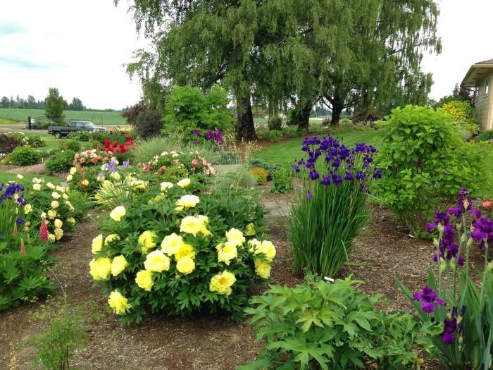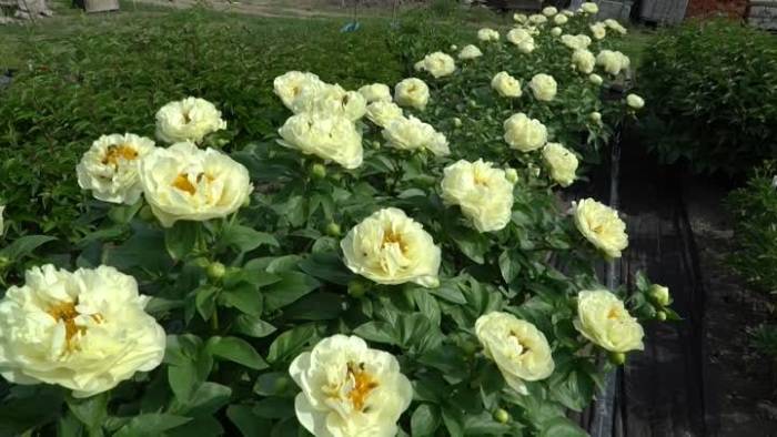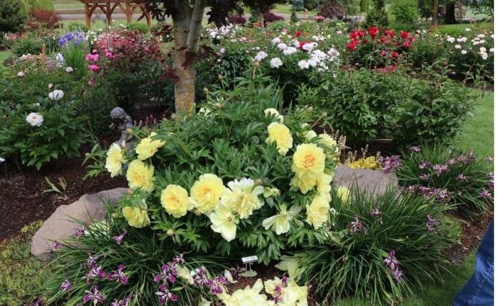 Лимоновите божури образуват красива граница около кадифено зелената морава.