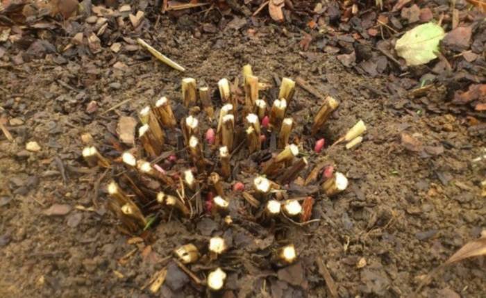 Стъблата над растежните пъпки се оставят 4-5 см, останалите се отстраняват. Други стъбла се отрязват до самия корен. Местата на порязванията и почвата наоколо се поръсват с дървесна пепел. Това е хранене и дезинфекция.