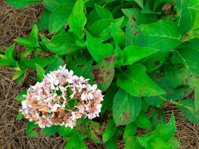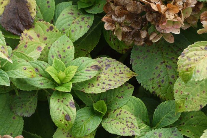 Всеки вид или разновидност на хортензия може да се зарази с инфекциозно или гъбично заболяване. В резултат на това листата на храста променят цвета си и с течение на времето изсъхват, извиват се и след това падат. За да се избегне това, е необходимо да се вземат мерки за лечение, да се извърши превенция.
