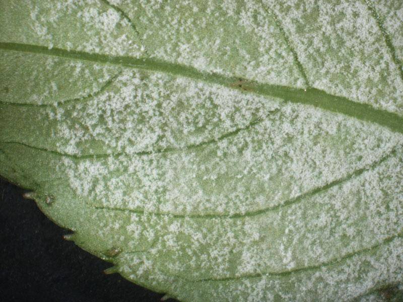 Белият цвят на листната плоча е характерен симптом на гъбично заболяване, брашнеста мана. Болестта се разпространява много бързо. Листата не само са покрити с бял цвят, но и започват да пожълтяват, да се извиват и да падат.