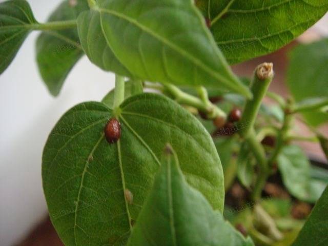 Определянето на появата на мащабни насекоми е съвсем просто. По листата се появяват малки кафяви подутини. Най-често те са разположени по протежение на вените.