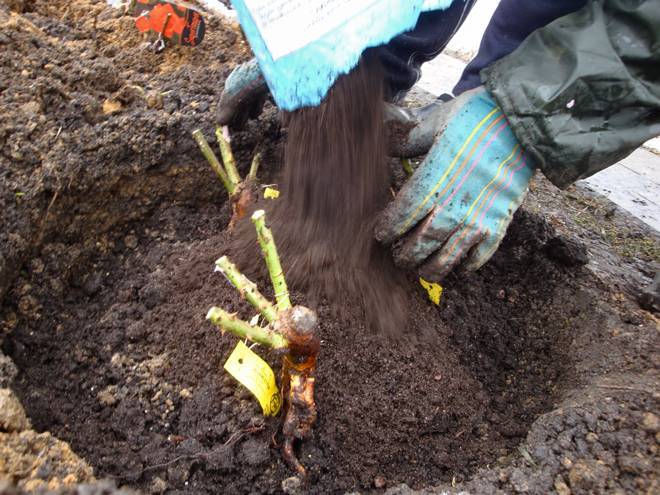- Почвата се изсипва върху тора, от него се образува малка могила, върху която се поставя растението, внимателно изправяне на корените.