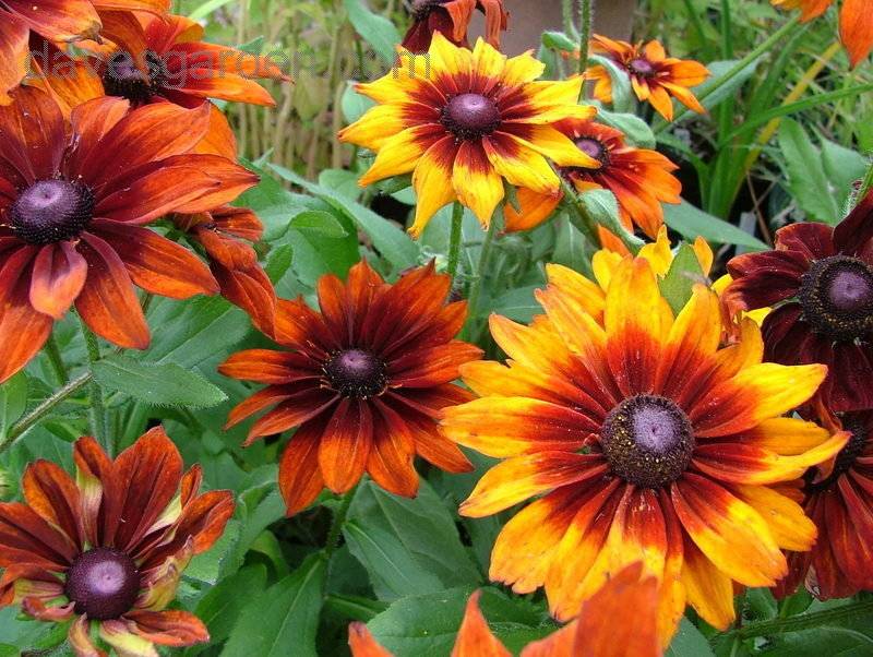 Ярко разнообразие е двуцветната рудбекия. Неговите езичести цветя са двуцветни - оранжеви или червени в основата и жълти по краищата, което е причината за името.