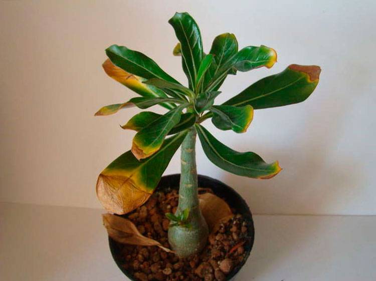 Thông thường, adenium bị ảnh hưởng bởi thối và nấm, là kết quả của việc tưới nước không đúng cách. Trước hết, cả hai bệnh đều bắt đầu gây hại cho cây caudex, khiến không chỉ ra hoa, mà cả sự phát triển của bụi cây không chỉ dừng lại: lá chuyển sang màu vàng, chồi bị rụng, không có thời gian để hình thành bình thường.